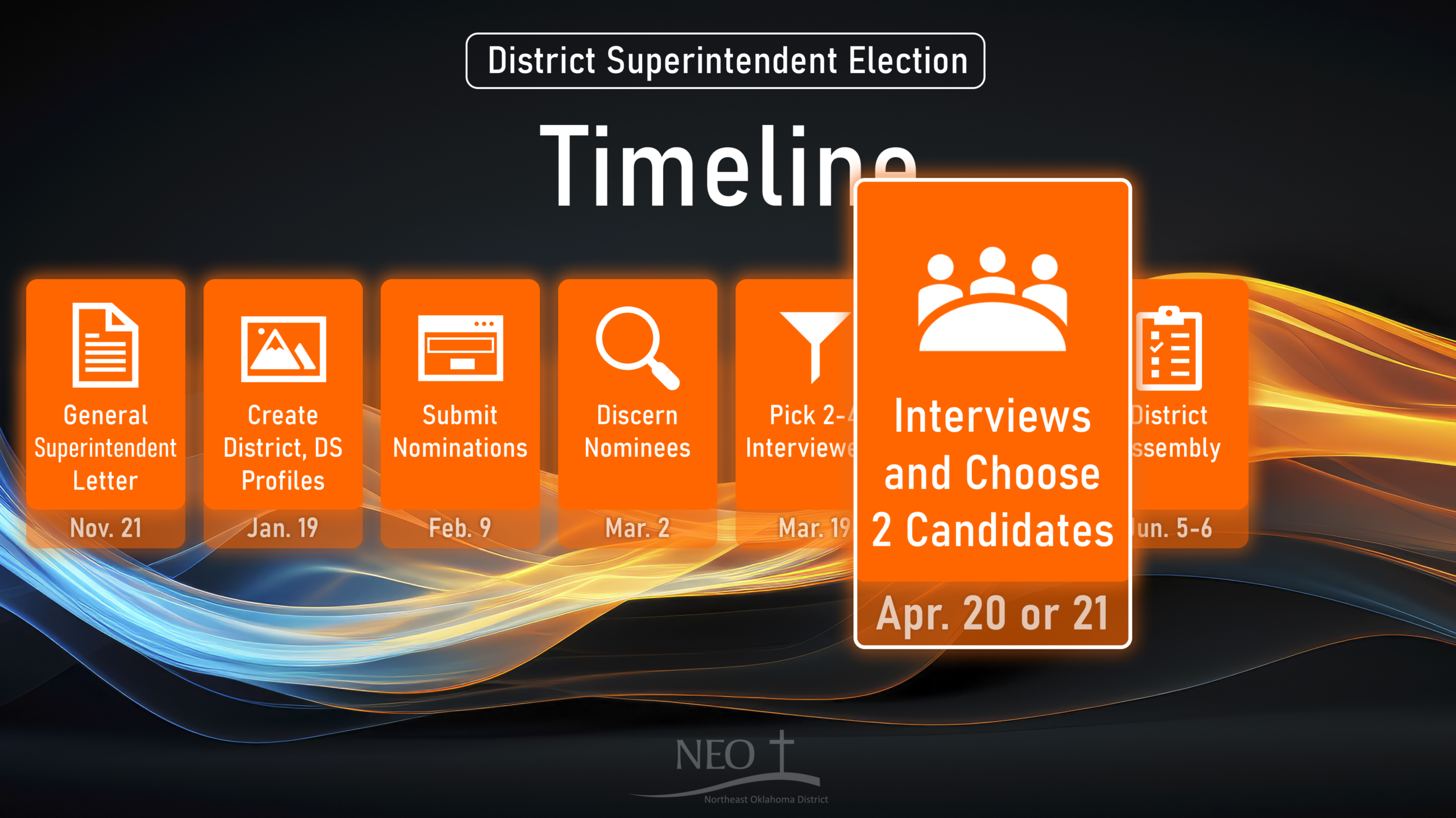 Our General Superintendent in Jurisdiction, Dr. David Busic, will reach out to potential interviewees using this prioritized list. Not every candidate may agree to be interviewed. Once four have accepted, interviews will be scheduled for the week of April 20, 2026. The plan calls for all interviews to take place on the same day, and for the DAC to decide on two names to submit to the District Assembly immediately following the interviews.