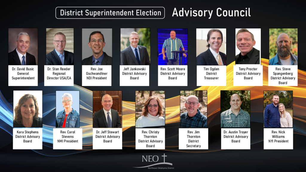 The District Advisory Council (DAC) has been tasked to present two candidates to the District Assembly next June 5 and 6 to elect a new District Superintendent. This council is composed of the District Advisory Board (DAB), the Treasurer, the District Secretary, and the NMI, NYI, and NDI presidents. The General Superintendent in Jurisdiction, Dr. David Busic , and the Regional Director, Dr. Stan Reeder, provide leadership and advice to the council.