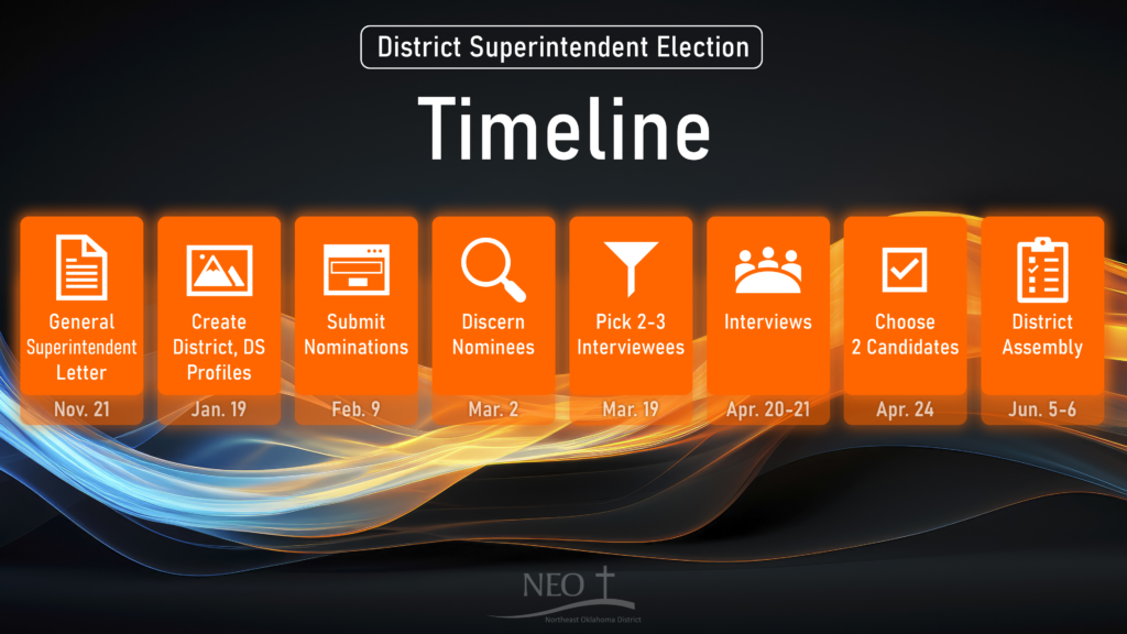 The most important contribution each of us can make during this process is to pray. We want to ask God that the person He has prepared be elected in June. Expect regular prayer updates in the next months here, via e-mail, and on the District Facebook page.